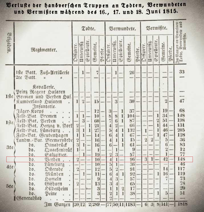Bataillon Verden hohe Verluste. Johann Wilhelm Baden aus Tewel fällt.