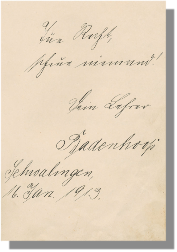 scheue niemand! Dein Lehrer Badenhoop, Schwalingen, den 16.Jan.1913".